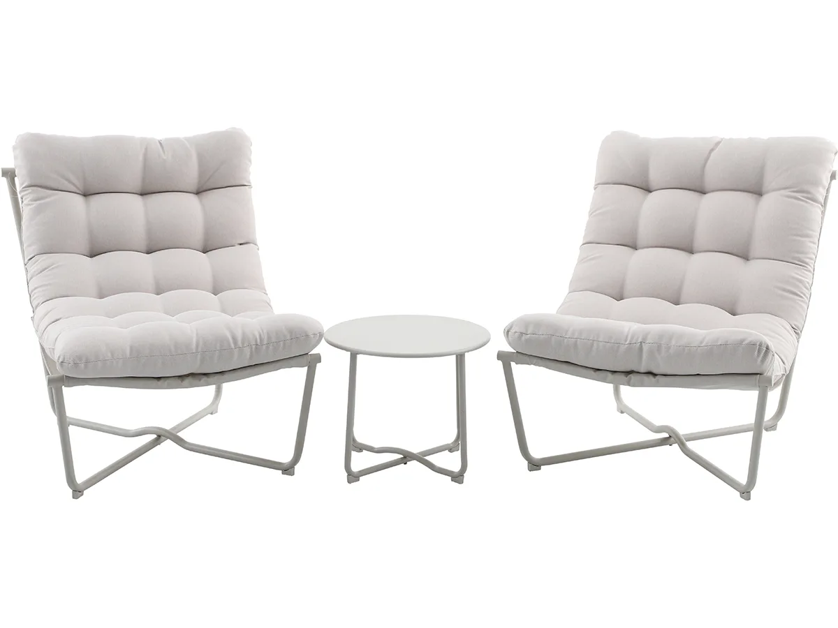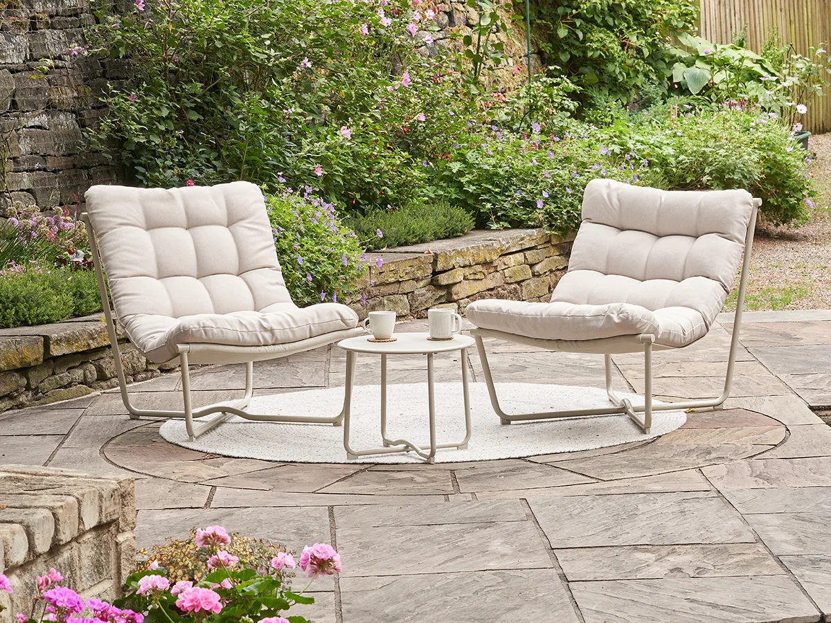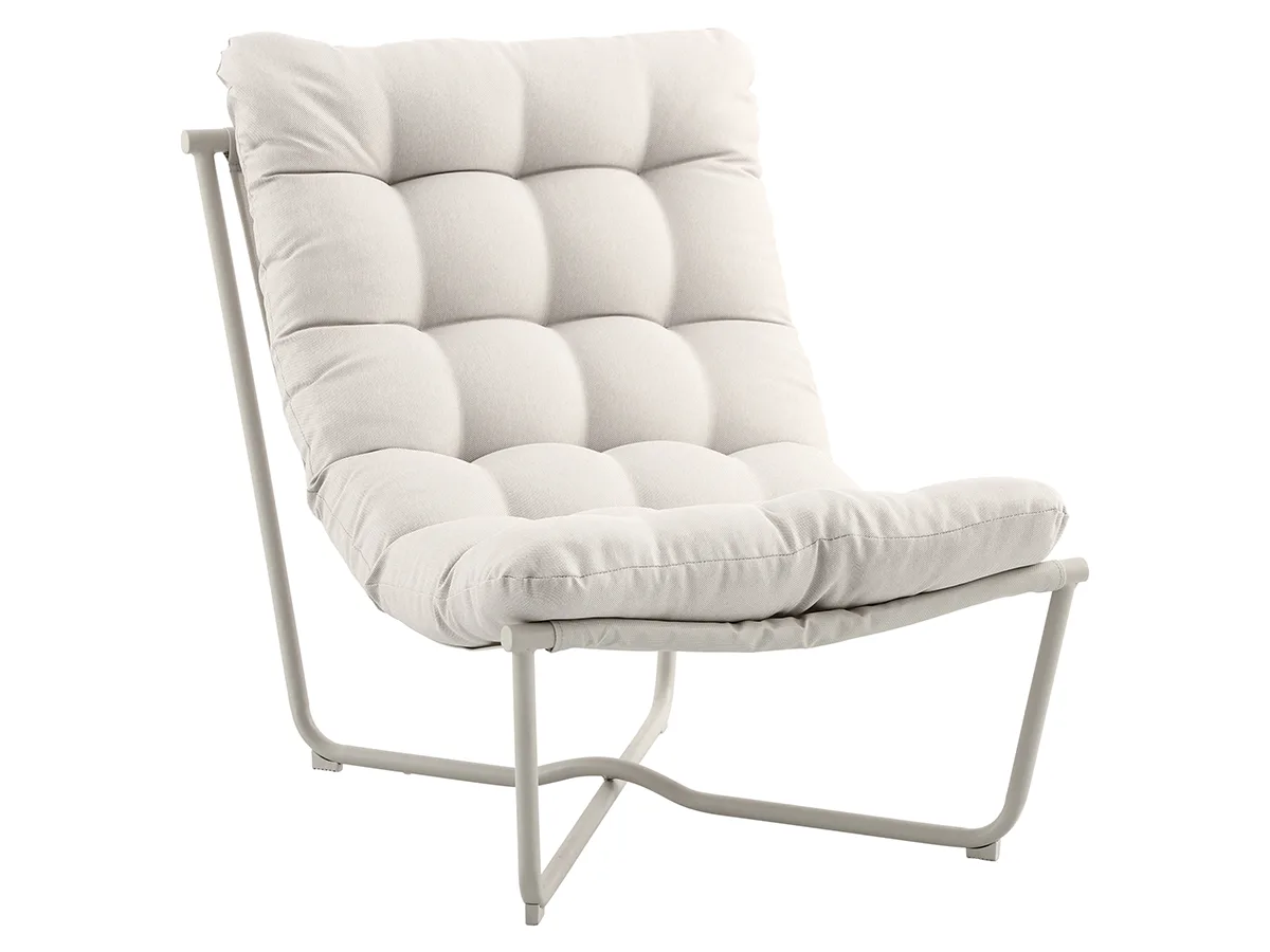 The lounge chairs feature cream coloured quilted cushion upholstered in Olefin fabric, the industry leading material for outdoor furniture, thanks to its durability and quality.