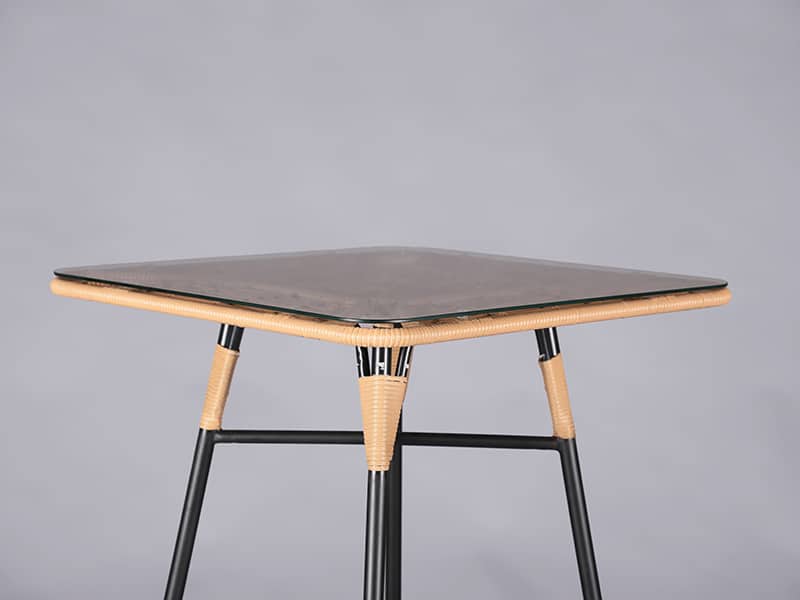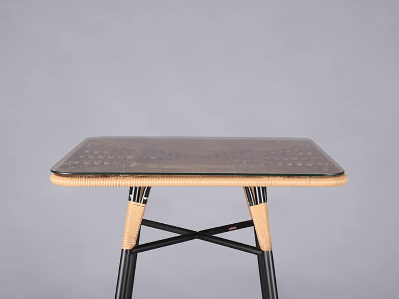 This design-led piece features a glass top, woven rattan frame, and sleek black metal legs for a modern, sophisticated look.