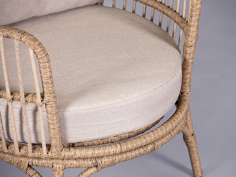 The contemporary armchair features a stunning rattan woven look and soft grey cushions to complement it. It is suitable for outdoor events and also trendy enough for indoor events!