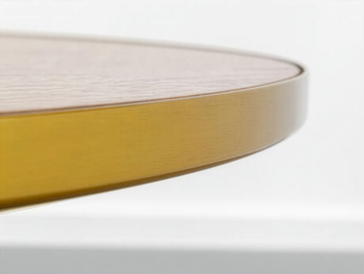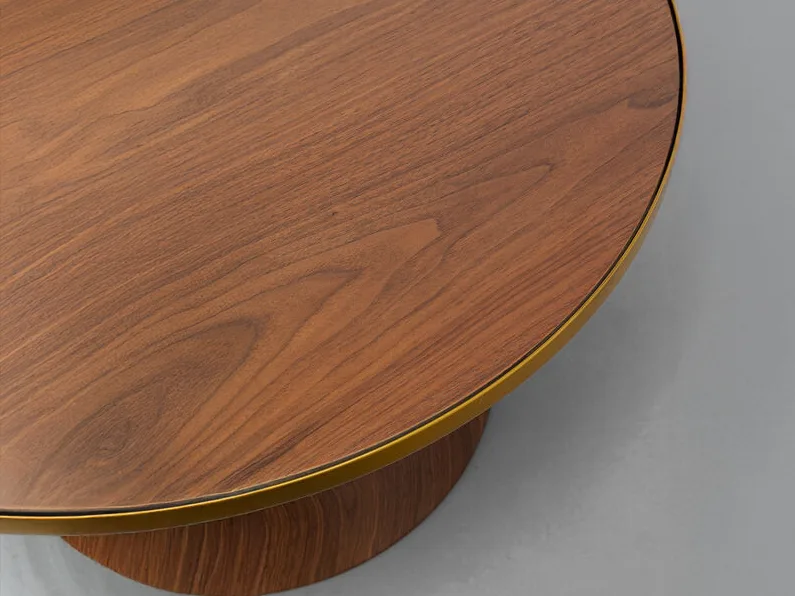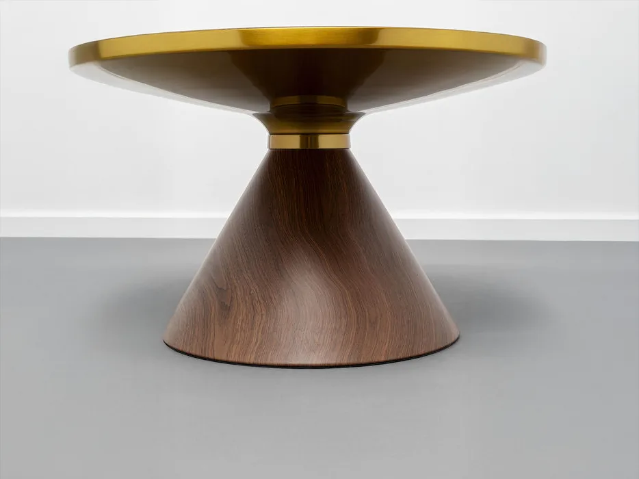 The striking grain of the wood brings warmth to any living room, while the stylish, cone-shaped steel base combined with golden accents in titanium-coated steel adds a luxurious touch.