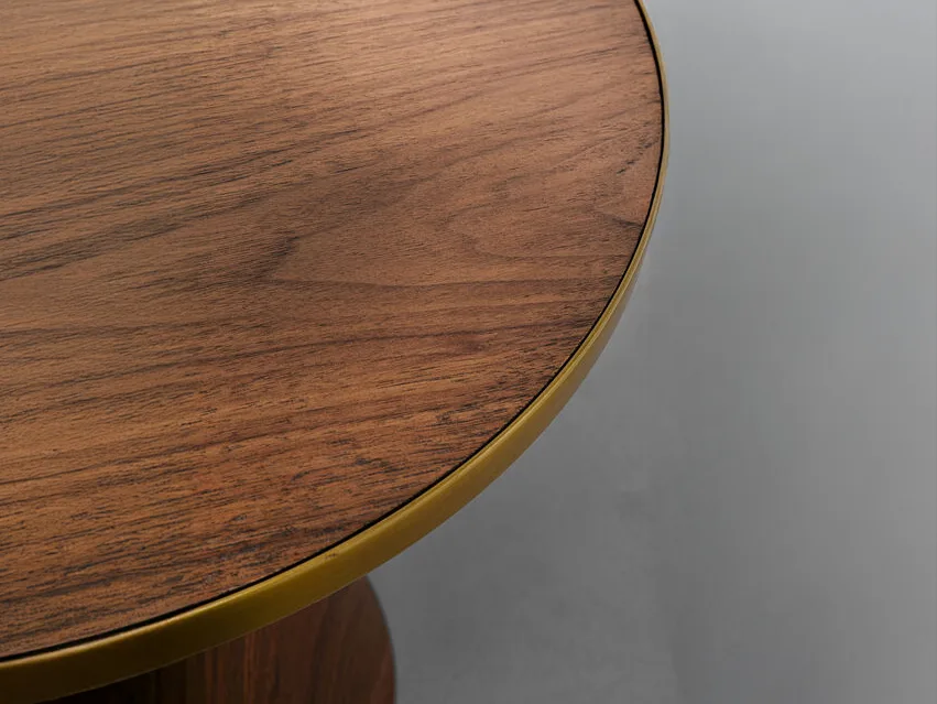 The round walnut-tone tabletop showcases a rich, natural grain, adding warmth and visual depth to lounges and styled spaces.