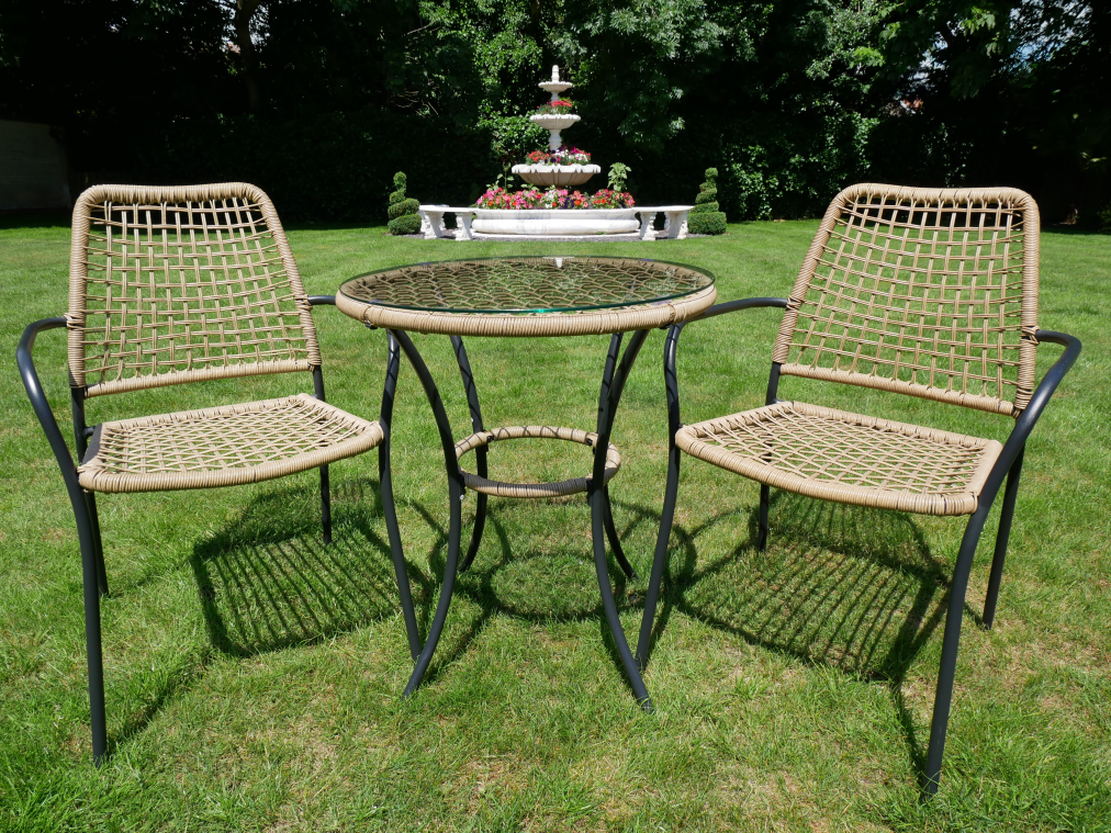A modern take on the traditional garden table, the Campeche table features PE rattan weave and a slim black metal frame.