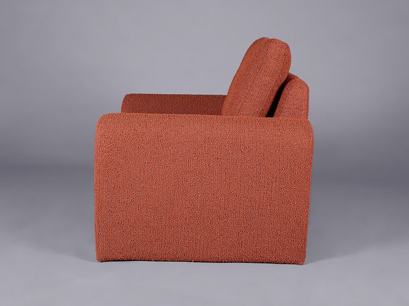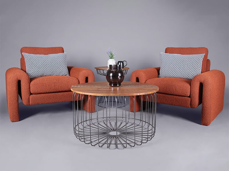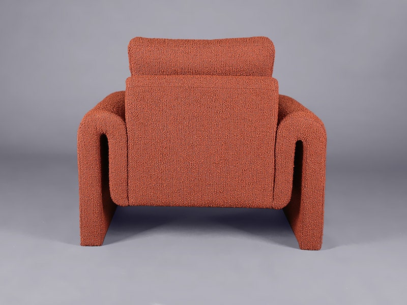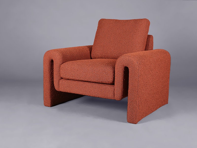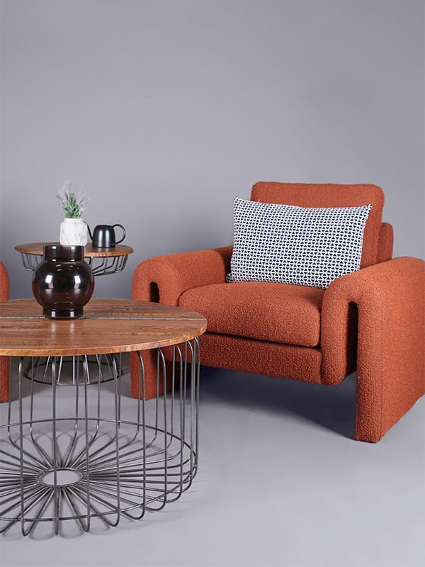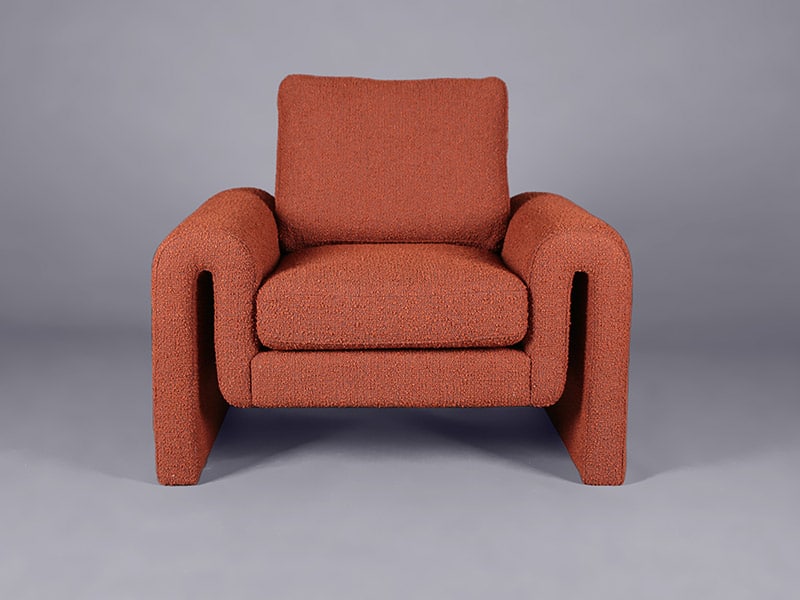 Get bold with bouclé and hire the Muscat chair. This super stylish accent chair takes inspiration from the original designs of the 70s and features a bouclé upholstery in a shade or rust red. Pair it with geometric accents to make a statement,
