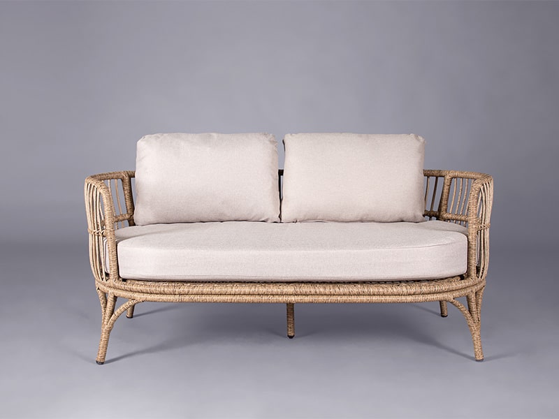The 2 seater sofa features rattan weaving for a natural look and soft grey cushions suitable for outdoor use.