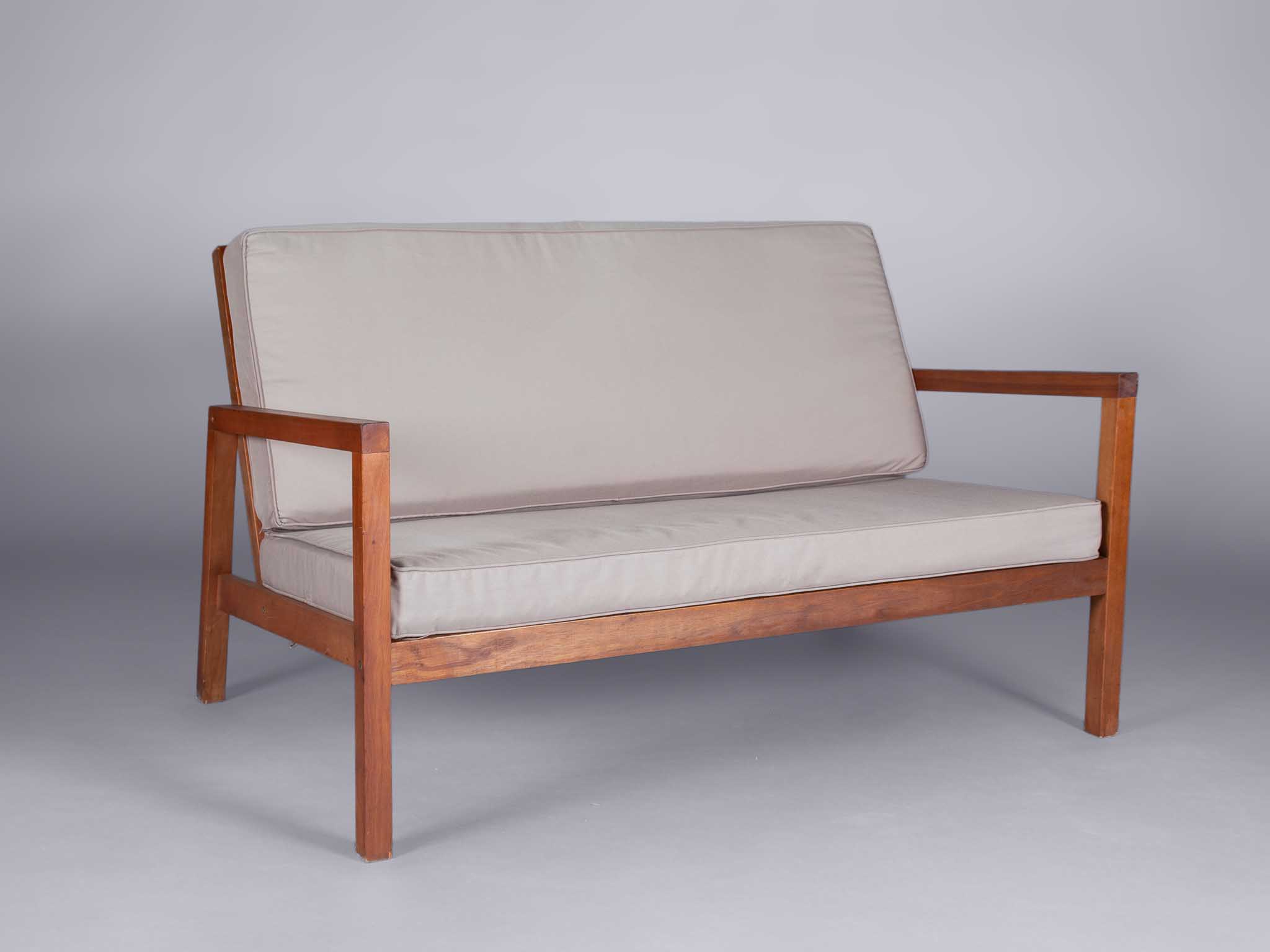 Featuring an outdoor fabric cushion in a neutral shade of grey and a sturdy wooden frame.