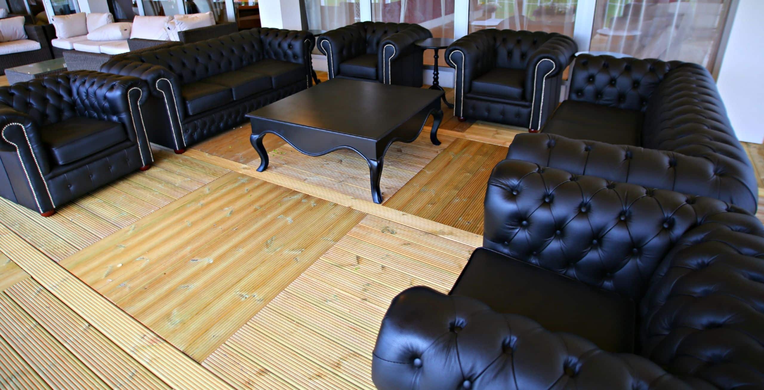 A design classic, this Chesterfield Sofa comes in matte black leather. The dark colour is complemented by silver studwork and dark wooden feet. Hire it for any event that has a classic feel.