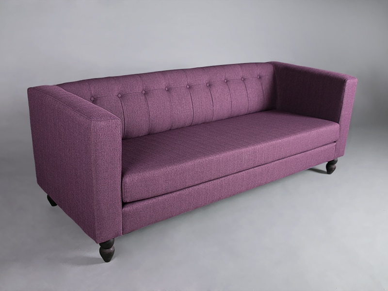 This gorgeous sofa is available in three trendy colours: grey, purple and teal. Here, you see the purple version. Its extra comfy cushions provide a welcome resting space for your guests. It seats three, although four could squeeze on!