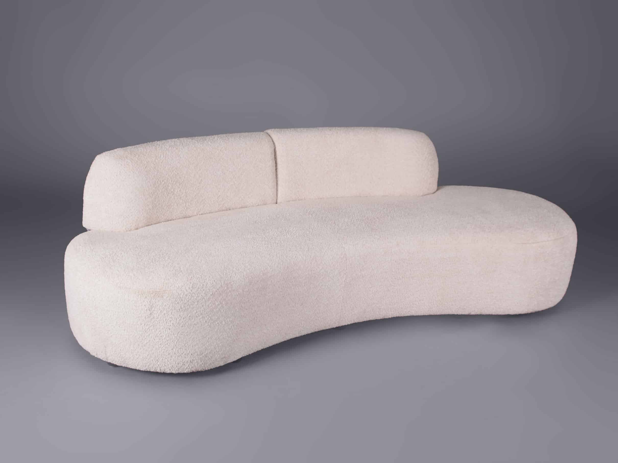 The sofa features a sleek and stylish curved silhouette and a cream-coloured bouclé fabric upholstery, blending modern aesthetics and timeless charm.