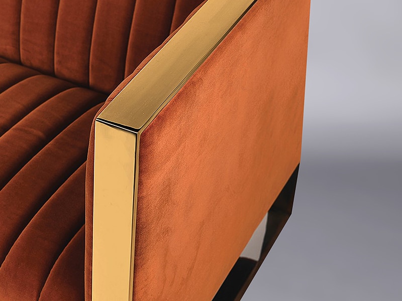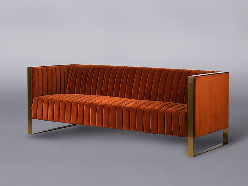 Finished in a glorious burnt orange velvet, this is one of our favourite new sofas. As the original two seater sofa was so popular, we decided to get in a selection of three seaters as well. The gold accents make this an elegant statement piece. We’ve seen it used effectively in casino-style set ups, 70s retro events, and to help create an art deco vibe.