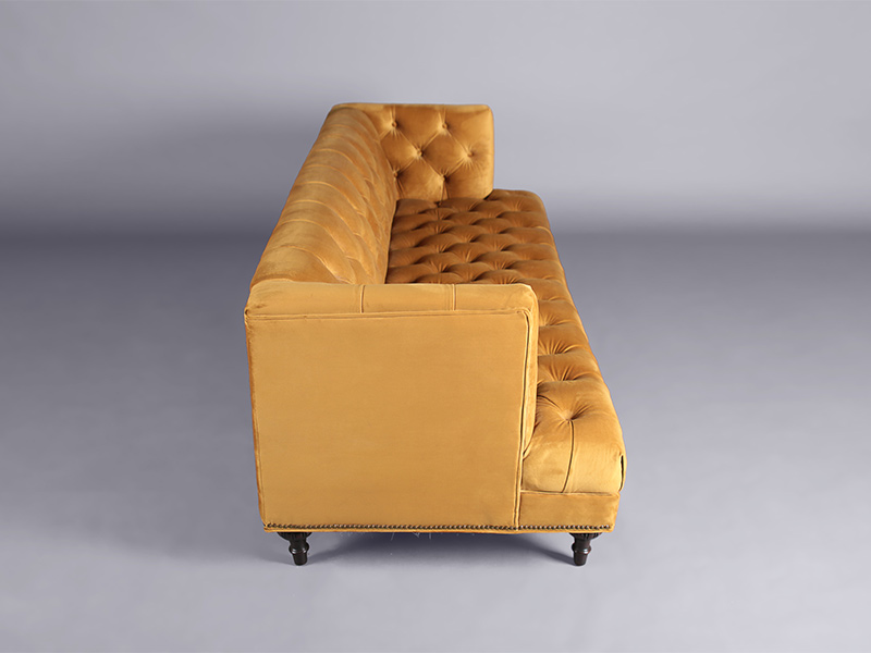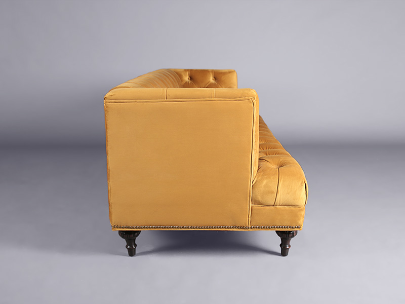 This three seater sofa is upholstered in a gorgeous mustard velvet fabric. The button back and ornate legs give it an elegant vintage look.