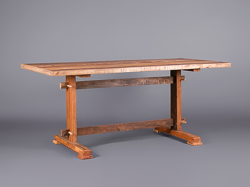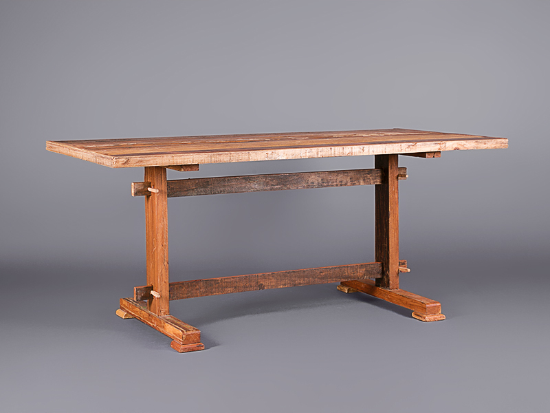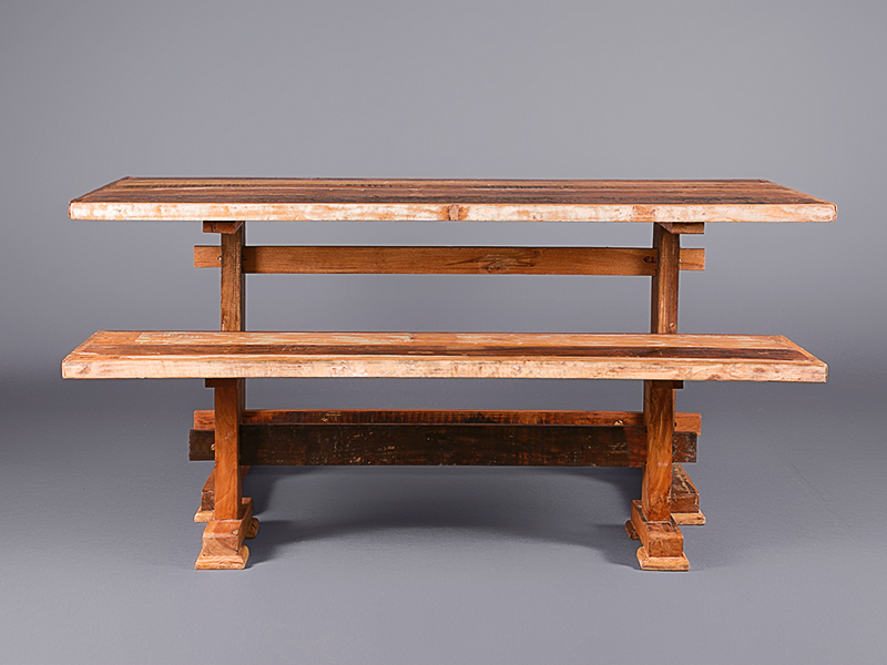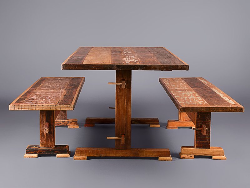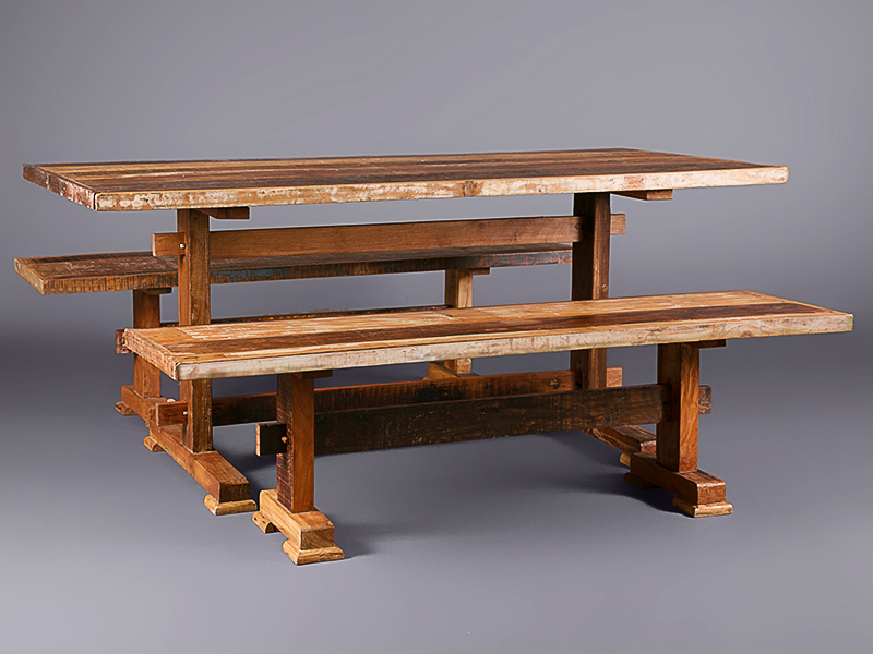 This unique, handcrafted timber dining table has an interesting back story. You can read it on our blog here. It’s made from reclaimed wood, and there’s a matching bench available.
