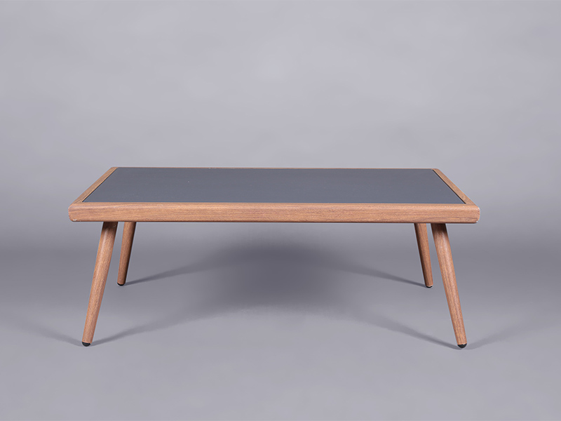 The Amalfi coffee table features a stylish combination of wooden effect aluminium and an elegant frosted glass top.