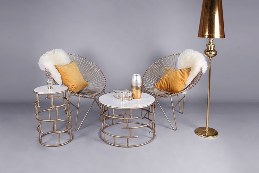 This artistic little table is ultra stylish. With its geometric gold frame and elegant marble top, it looks beautiful next to the Nevada gold chair. We’ve got a matching side table, so you can hire a selection of both to tie your look together.