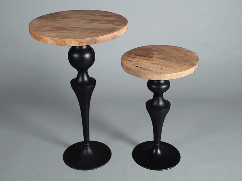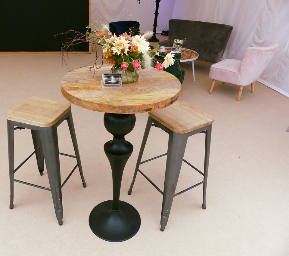 With its mango wood top and black aluminium base, this poseur table has a unique style. We loved the design so much, we invested in lots of matching bistro tables. Scroll through the picture to see them side by side.
